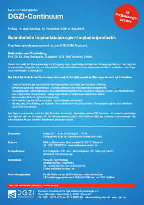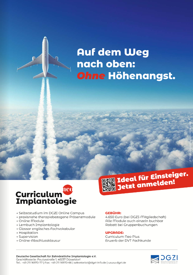 Als Grundlage des Tätigkeitsschwerpunktes Implantologie, der gerade bei implantologisch geprägten Patienten einen hohen Stellenwert auf der Suche nach einem geeigneten Behandler hat, ist das aktuelle implantologische Curriculum der DGZI heute eine unerlässliche Grundlage der Qualifizierung junger Zahnärzte und Zahnärztinnen in Deutschland und Europa.