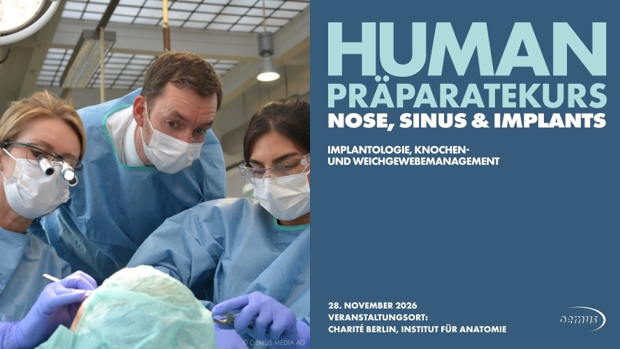 Am 28. November 2026 findet der Humanpräparatekurs "Nose, Sinus & Implants" in Berlin statt.