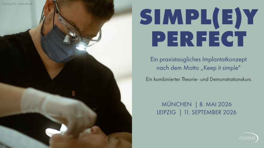 Das Seminarangebot der OEMUS MEDIA AG hat sich um weitere spannende Produkte erweitert. Aktuell bieten wir interessierten Zahnärzten das Seminar "Simpl(e)y Perfect – Ein Konzept aus der Praxis für die Praxis" neu an. Dr. Alexander Müller-Busch, renommierter Seminar- und Kongressreferent, präsentiert mit diesem Seminar ein hochinteressantes, praxistaugliches Konzept für Einsteiger und Fortgeschrittene. Gerade als Einsteiger im Feld der Implantologie, aber auch als jemand, der hier seine Erfahrungen vertiefen und erweitern möchte, gibt es aktuell eine Vielzahl an Angeboten, egal ob es Kurse zum Thema Sofortimplantation, Weichgewebsmanagement oder unterschiedlichen Augmentationstechniken sind. Und hat man den "anscheinend passenden" Kurs für sich gefunden, deckt er leider oftmals nur ein kleines Teilgebiet der gesamten Implantologie ab. Wie schnell kann man das Gelernte, die vermittelten Techniken in die Praxis umsetzen, auch um diese Fragestellung geht es Dr. Müller-Busch in seinem Seminar. Das Praxiskonzept orientiert sich stets an dem Motto "Keep it simple". Von Einsteigern bis Fortgeschritten vermittelt Ihnen der Kurs das nötige Wissen, um Patientenfälle von einfach bis komplex eigenständig zu therapieren.