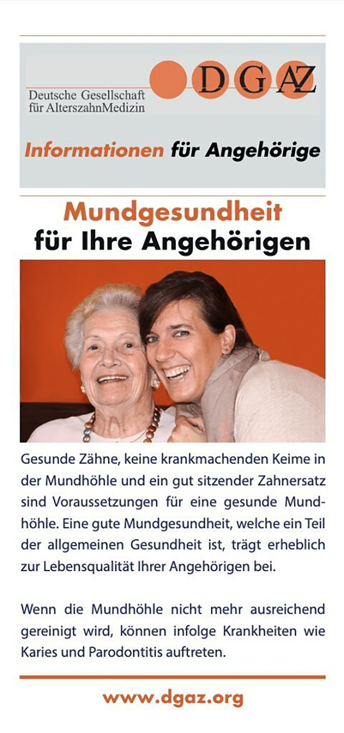 In der Betreuung alter Menschen kommt den Angehörigen und Pflegepersonen eine zentrale Rolle zu. Sie sind nicht nur Begleitende, sondern auch wichtige Informations- und Motivationsquelle. Aufklärung, Anleitung und Wertschätzung ihres Beitrags zur Mundgesundheit sind essenziell. Eine ansprechende, gut verständliche Information wie der Flyer der Deutschen Gesellschaft für AlterszahnMedizin e.V. (Abb. links) kann helfen, das Thema Zahngesundheit im Pflegealltag präsent zu halten. Oft genügt ein kleiner Impuls, um große Wirkungen zu erzielen, etwa das tägliche Reinigen einer Prothese konsequent umzusetzen. Hierfür können auch die Instruktionsvideos zur Mundpflege hilfreich sein.