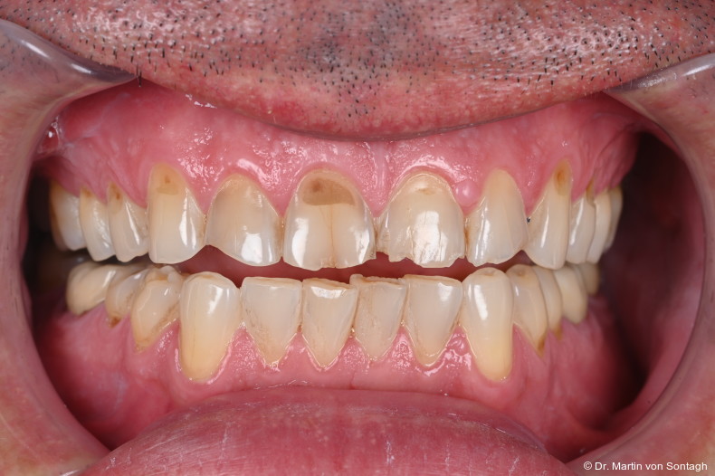 Die extraorale Untersuchung ergab eine leichte Hypertrophie der Kaumuskulatur mit palpatorischer Druckempfindlichkeit, was auf eine parafunktionelle Überlastung hindeutete. Intraoral präsentierten sich generalisierte Attritionen mit Dentinexposition, eine abgeflachte okklusale Morphologie, verkürzte klinische Kronen sowie ein Kollaps der vertikalen Dimension. Im anterioren Bereich waren die Inzisiven aufgrund der Substanzverluste funktionell und ästhetisch stark beeinträchtigt, teils unregelmäßig und im Lächeln nicht mehr sichtbar.