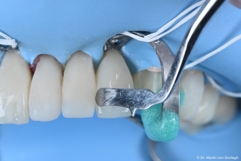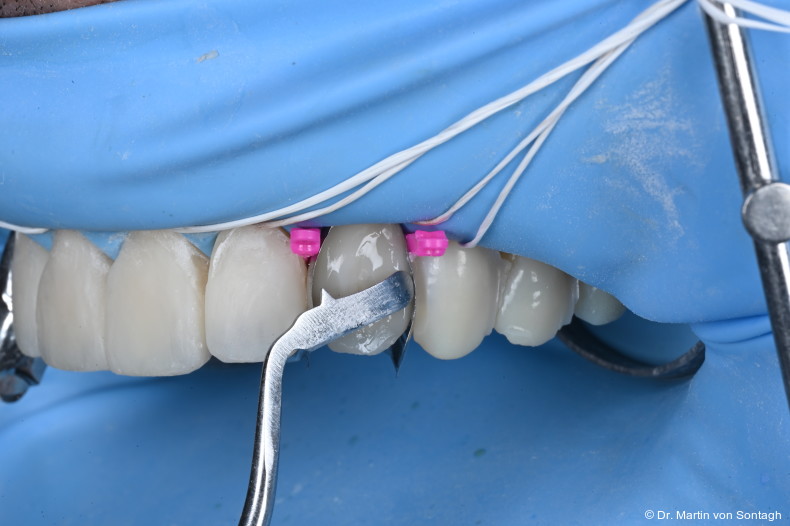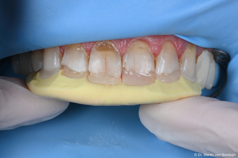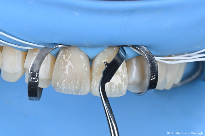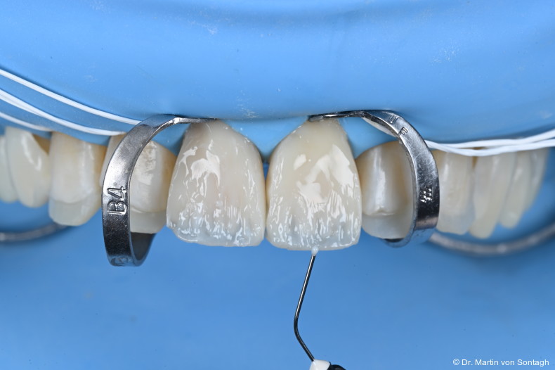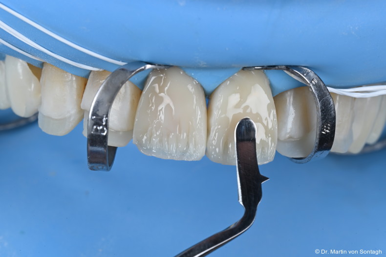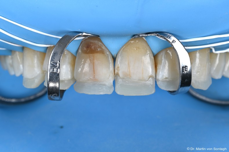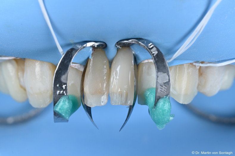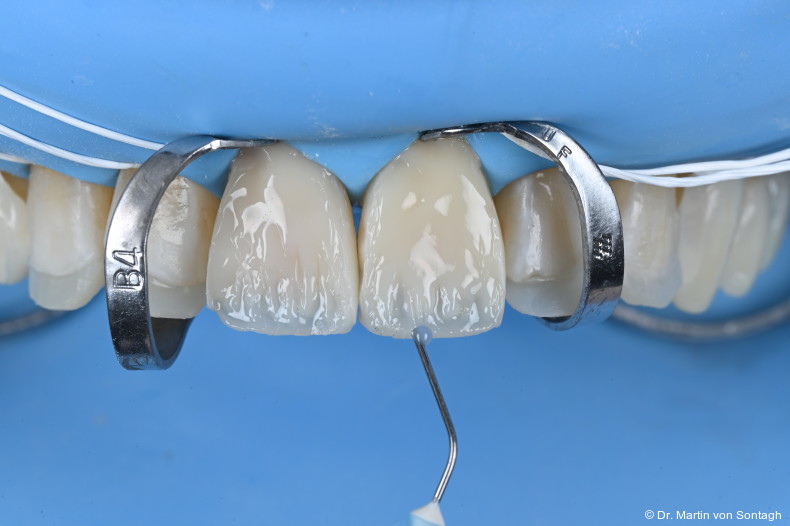 Die simultane Rekonstruktion der Zähne 11 und 21 erfolgte unter Verwendung beidseitig angebrachter B4-Klammern, wodurch die gesamte Zahnoberfläche zugänglich war (Abb. 4). Sämtliche Zähne wurden (wie im gesamten Fall) mit dem Aquacare-System und 29 µm Aluminiumoxid partikulär sandgestrahlt. Eine Präparation der Zahnhartsubstanz war nicht erforderlich.