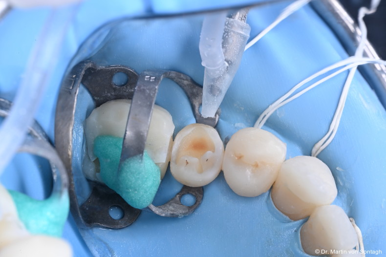 Die Schmelzoberflächen wurden für 30 Sekunden mit 35-prozentiger Phosphorsäure konditioniert. Auf exponierten Dentinarealen wurde Chlorhexidin 2 % appliziert, um die Aktivität der Matrix-Metalloproteinasen (MMP) zu hemmen. Als Adhäsiv kam Adhese Universal® (Ivoclar) in der VivaPen-Applikationsform zur Anwendung. Das Dentin wurde mit einer dünnen Schicht fließfähigen Komposits (Tetric EvoCeram® Flow, Farbton A2, Ivoclar) versiegelt.