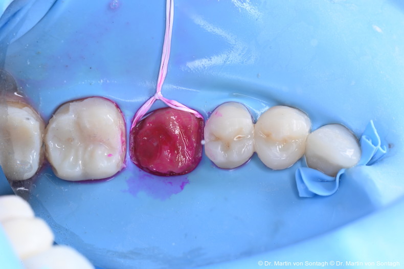 Die Rehabilitation begann aus ästhetischen und symmetrischen Gründen im Oberkieferfrontzahnbereich von Zahn 13 bis 23. Zunächst wurde die geteilte Kofferdam-Technik (Split-Dam) angewandt, um mithilfe eines Silikonschlüssels die palatinale Wand von 13-23 zu rekonstruieren (Abb. 3). Diese Technik erleichtert das Entfernen des Split-Dams und ermöglicht eine direkte Kontrolle der Okklusion. Anschließend erfolgte die vollständige Isolation der Regio 17-27 unter Einbeziehung von Ligaturen, um optimale Feuchtigkeitskontrolle, Übersicht und damit verlässliche Haftwerte sicherzustellen.