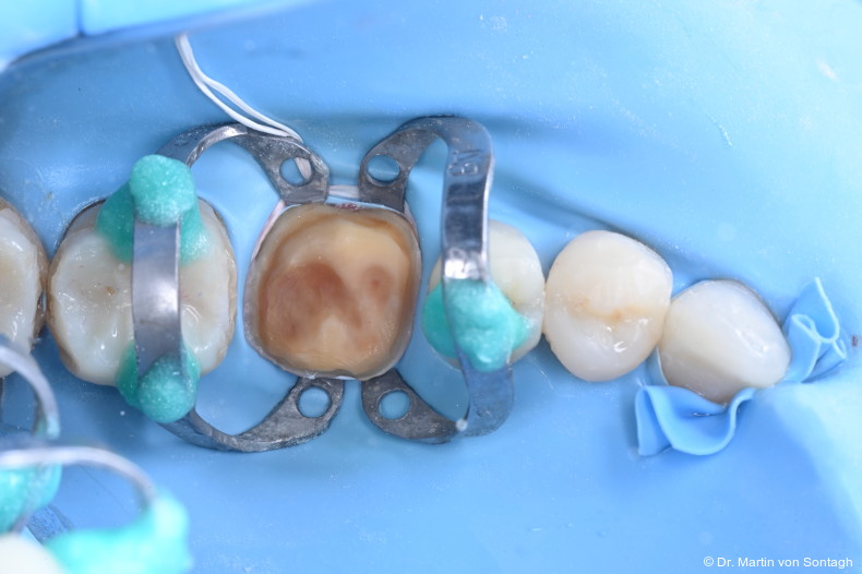 Für die approximalen Ränder wurden Unica-Matrizen (Polydentia) eingesetzt. Anschließend erfolgte der Aufbau der Ränder mit einer Dentin-