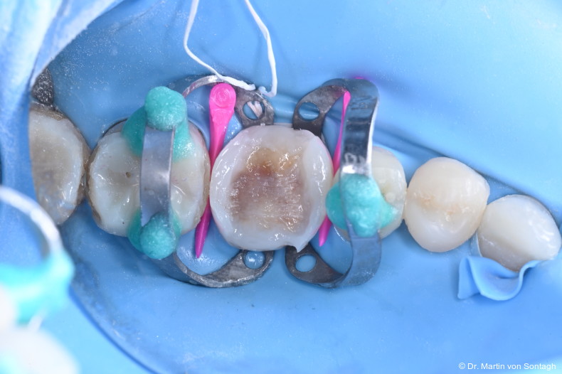 Die Isolation erfolgte mittels zwei B4-Klammern, um den Kofferdam zu stabilisieren und die Ränder sauber zu halten. Das Klebeprotokoll entsprach dem zuvor beschriebenen Standard. Für die Approximalwandgestaltung wurden zwei Quickmat FiT Matrizen (Polydentia) eingesetzt und mit myWedge-Keilen (Polydentia) sowie den B4-Klammern fixiert (Abb. 14).