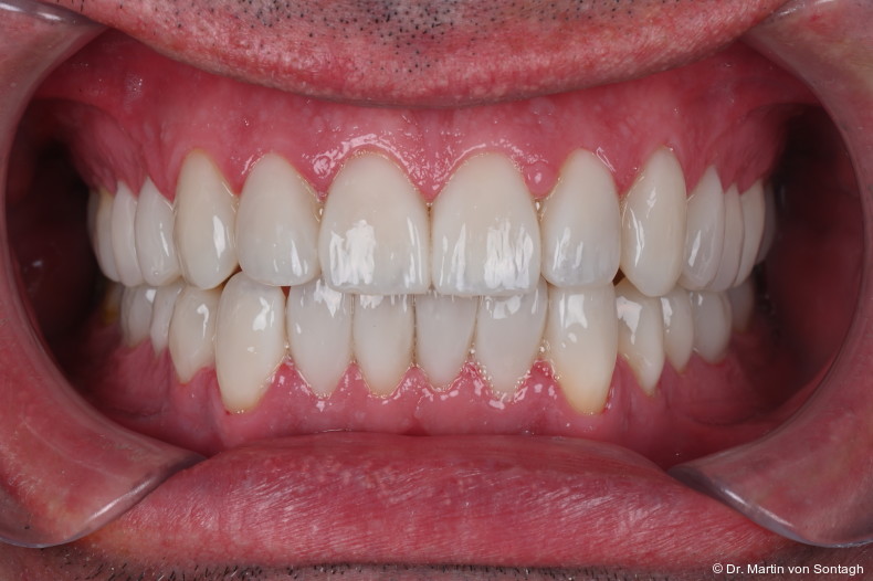 Da der Patient eine Präparation der Restzahnsubstanz zur Aufnahme konventioneller Kronen strikt ablehnte, wurde ein konsequent minimalinvasives Behandlungskonzept gewählt. Unter Verwendung direkter Kompositrestaurationen konnte sowohl die funktionelle Okklusion als auch die dentofaziale Ästhetik wiederhergestellt werden.