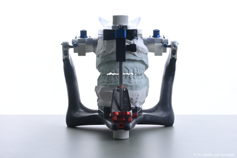 Die Bissregistrierung wurde in zentrischer Relation (CR) durchgeführt, unter Anwendung der intraoralen stützstiftgeführten Registrierung nach Prof. Dr. A. Gerber (Abb. 2). Daraufhin wurde ein vollständiges Wax-up mit einer Erhöhung der vertikalen Dimension um 5 mm erstellt. Auf dessen Basis wurde eine Polycarbonat-Schiene, angefertigt, die der Patient tagsüber trug.