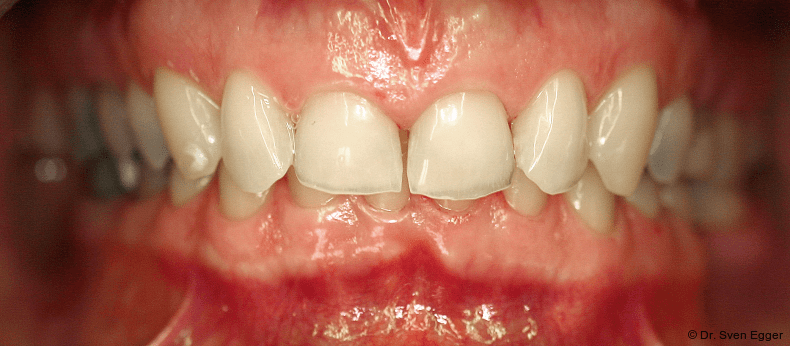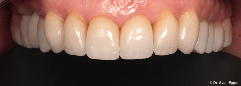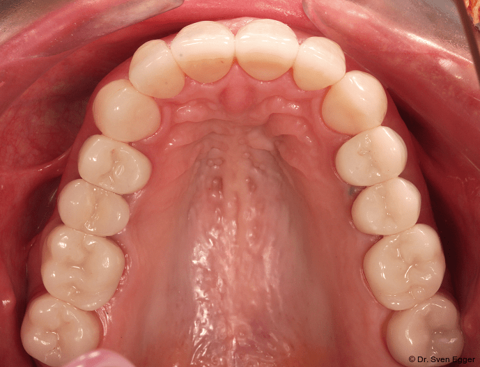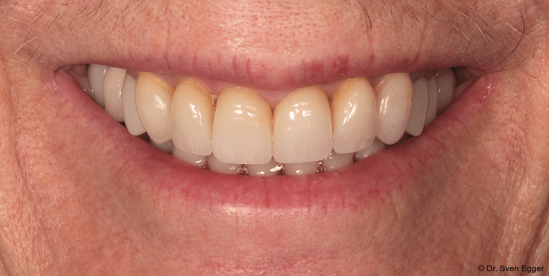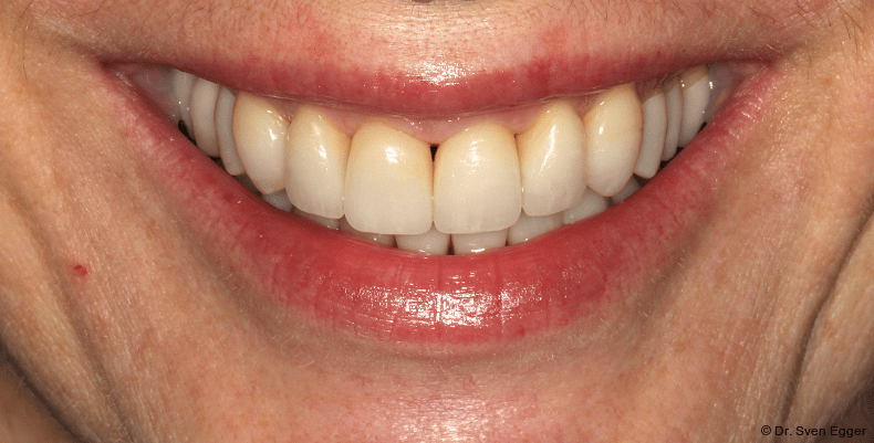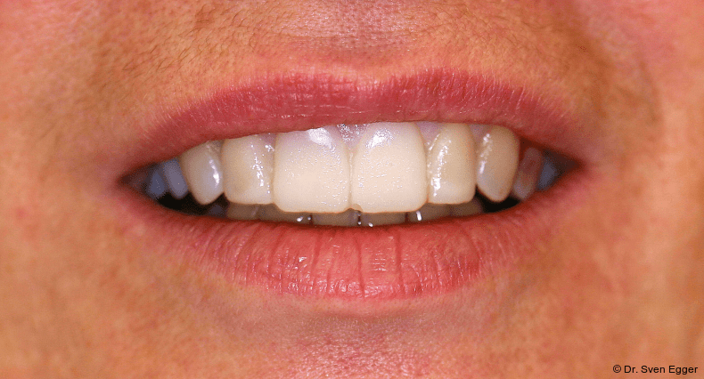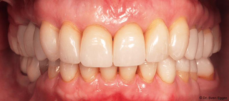 Abschließend betrachtet, stellt sich das Behandlungsergebnis auch für den Behandler in ästhetisch-rekonstruktiver Hinsicht als Erfolg dar. Die Prognose ist aufgrund der interdeferenzfreien Front-Eckzahn-Führung4 aus funktioneller Sicht betrachtet als positiv zu werten. Parodontal liegen keine Entzündungen vor. Die Patientin ist gesund. Das Tragen einer Nachtschiene wurde der Patientin empfohlen und wird auch konsequent befolgt.
