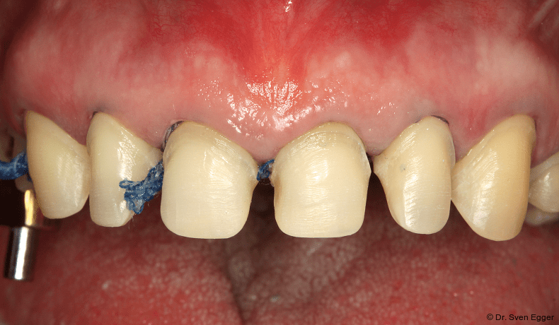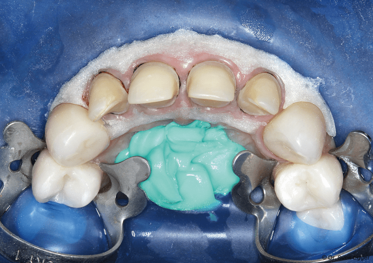 - Zweifache Abdrucknahme der präparierten Zähne mittels Doppelfadentechnik: Einbringen eines ersten, getränkten (Racestyptine solution, Septodont) Fadens (Ultrapak 0, Ultradent), über welchen ein zweiter getränkter Faden größeren Durchmessers gelegt wird (Ultrapak 1, Ultradent). Ca. zehn Minuten Wartezeit bis zur Abdrucknahme mit den gelegten Fäden.