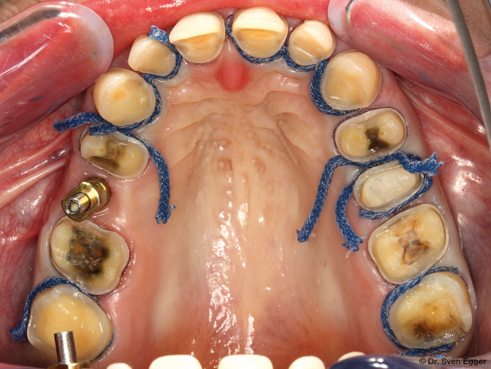 - Präparation der Zähne im Oberkiefer in lokaler Anästhesie (Articain 1:100 000, Aventis) unter Zuhilfenahme einer Lupenbrille (4,5-fache Vergrößerung, Zeiss).