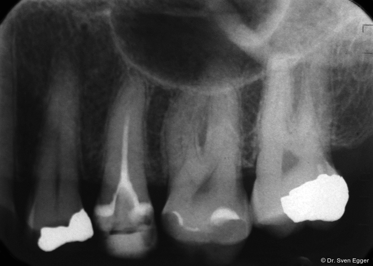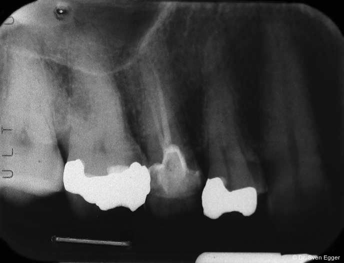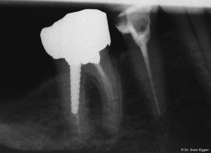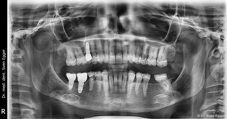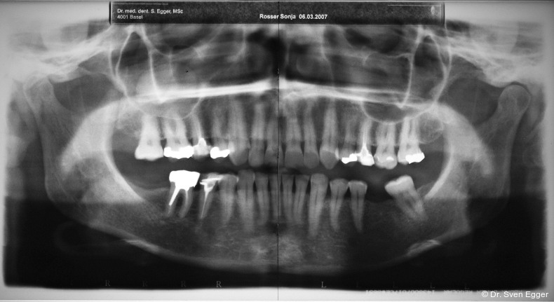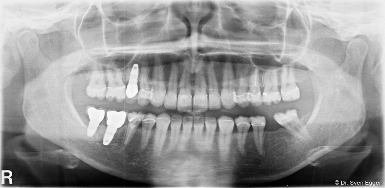- Revision der insuffizienten Wurzelfüllungen 15, 25 und 46. Bei Nichterfolg jeweils Extraktion, Ersatz durch Einzelzahnimplantat nach Abheilphase von zwei Monaten.