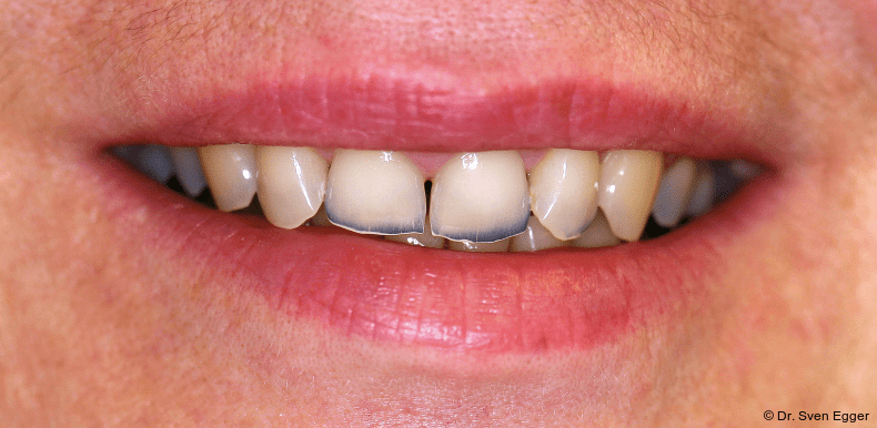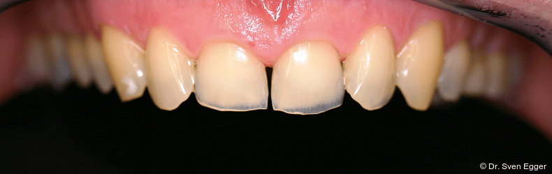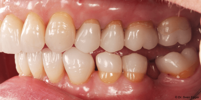 Bei der zahnmedizinischen Anamnese stellte sich ein hoher Konsum säurehaltiger Getränke (v. a. Coca-Cola light) heraus, welcher zu generalisierten Erosionen im Gebiss geführt hat. Die Zähne 36 und 47 wurden aufgrund endodontischer Vorbehandlung/Kronenfrakturen vor ca. vier Jahren entfernt. Der Leidensdruck, insbesondere verursacht durch die immer kürzer werdenden Frontzähne, bewog sie nach Aufklärung/Beratung zu einer Gesamtrestauration in allen vier Quadranten mit Presskeramikteilkronen und -veneers sowie drei Einzelzahnimplantaten.