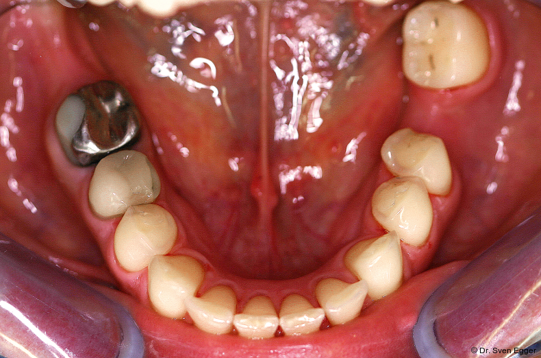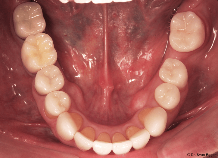 Es zeigen sich stabile und gesunde Weichgewebsverhältnisse nach abgeschlossener prothetischer Behandlung.