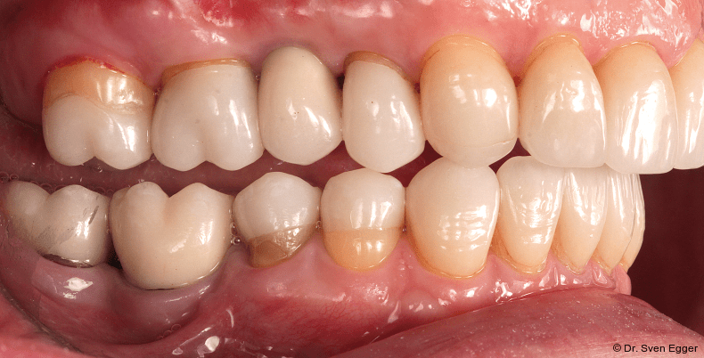 Die manuelle und klinische Funktionsanalyse ergab keinen auffälligen Befund. Für die dynamische Okklusion wurde eine Front-Eckzahn-geschützte Variante programmiert. Die manuelle Führung ergab keine Abweichung in maximaler Interkuspidation (ohne Führung) und zentraler Kondylenposition (mit Führung).