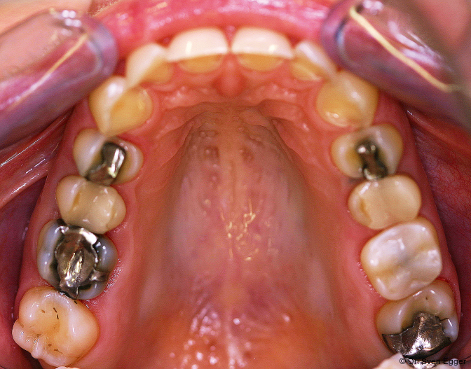 - Parafunktion mit massivem Zahnhartsubstanzverlust(Erosionen/Abrasionen) bei bestehender Deckbisssituation