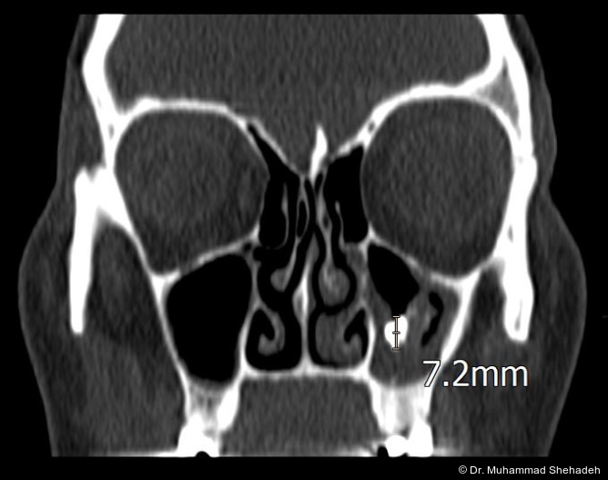 • CT ist die Methode der Wahl: da diese eine hypodense Raumforderung in der Kieferhöhle zeigt, die eine hyperdense Masse enthält, manchmal verbunden mit Mikroverkalkungen. Im - Laufe der Zeit können sich zusätzlich Sklerose (Verdickung der Knochenwände) oder sogar fokale Knochenerosionen der Sinuswand entwickeln.12