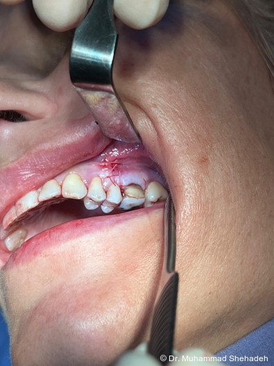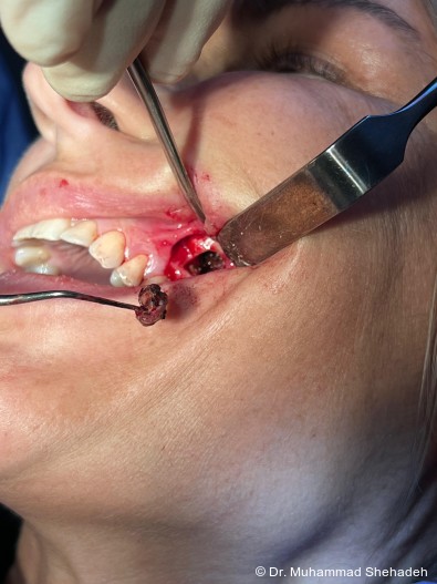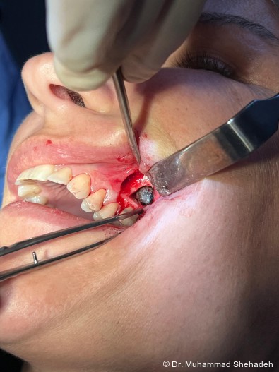 Nach ausführlicher Aufklärung wurde gemeinsam mit der Pa­tien­tin entschieden, den Zahn 26 durch eine Wurzelspitzen­resektion (WSR) zu erhalten und gleichzeitig den Fremd­­körper über den WSR-Zugang aus der Kieferhöhle in Lokal­­anäs­­thesie zu entfernen. Die operative Maßnahme erfolgte unter antibiotischer Abschirmung mit Amoxicillin/Clavulansäure.