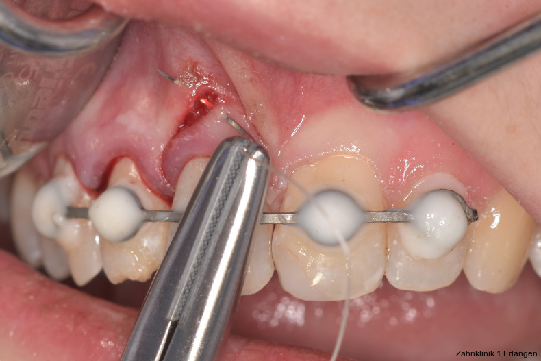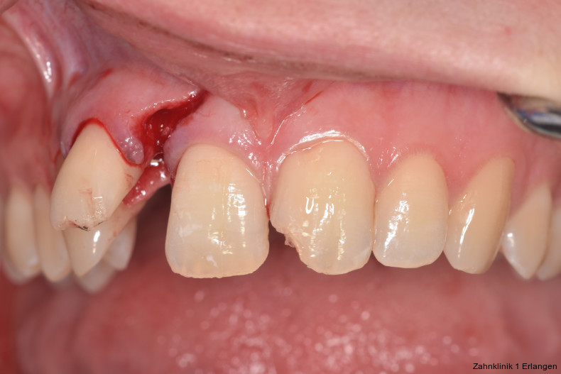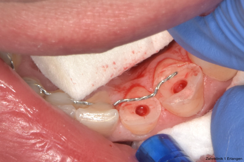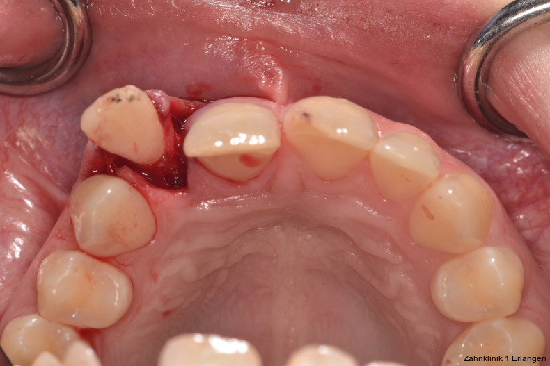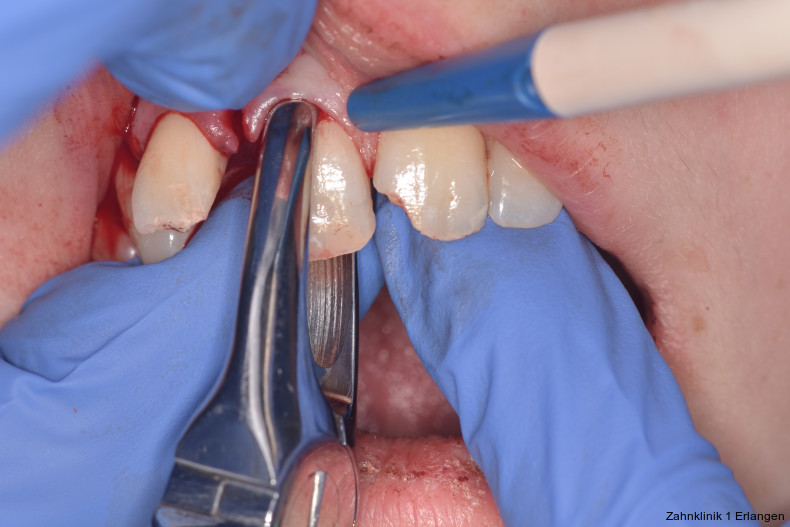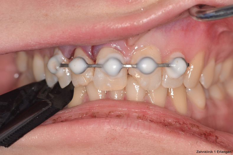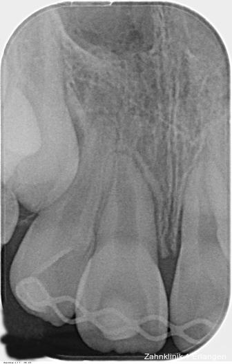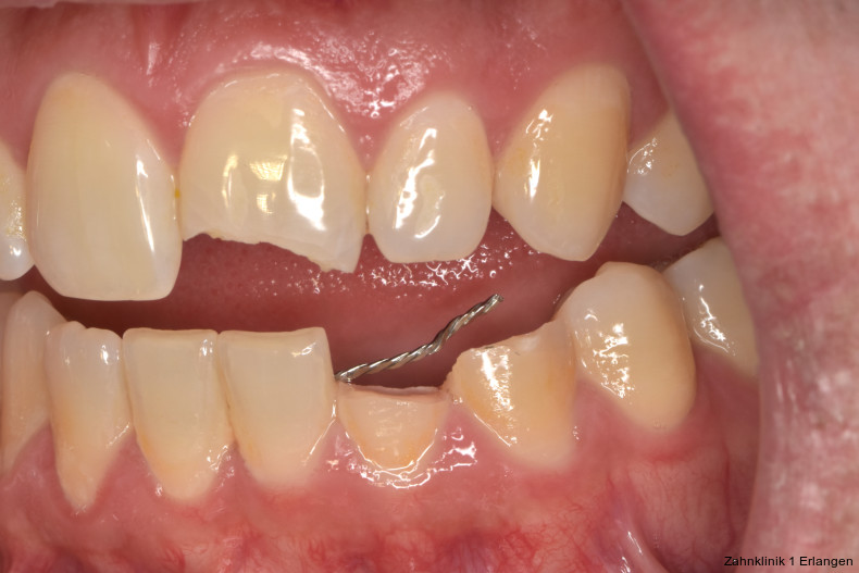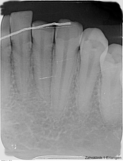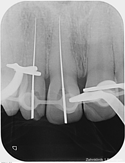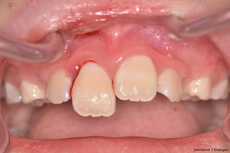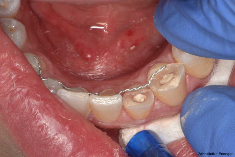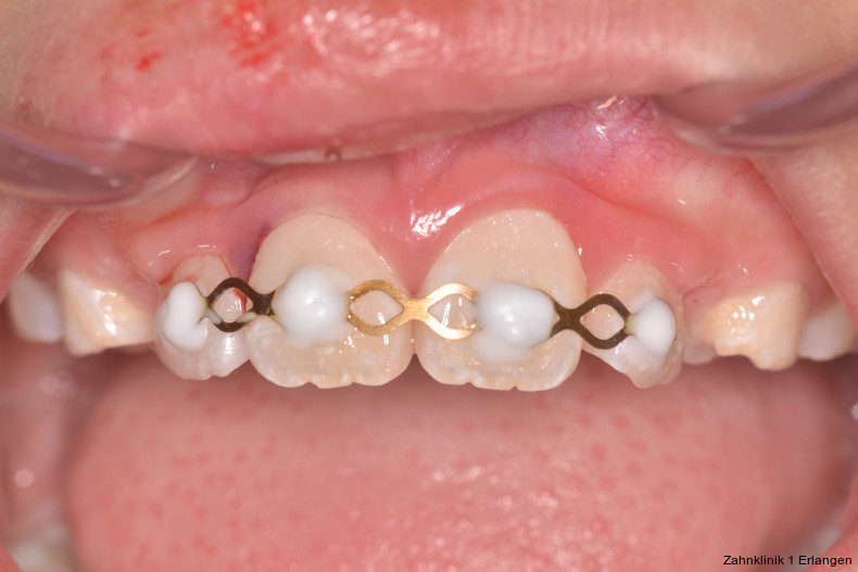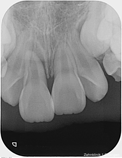 Bei ausgeprägten Dislokationsverletzungen stellt die Schädigung des Parodonts die dominierende Verletzung dar, die auch zu Spätfolgen und Komplikationen führen kann. Verletzungen des Endodonts sind im Hinblick auf den Zahnerhalt vergleichsweise unbedeutender, da die Wurzelkanalbehandlung eine Infektion relativ sicher verhindern oder beseitigen kann. Die Erstversorgung schließt im Wesentlichen die Repositionierung und Schienung zur Ruhigstellung der betroffenen Zähne ein.3 Spätestens ab einer Positionsveränderung von 2 mm ist bei Zähnen mit abgeschlossenem Wurzelwachstum sicher von einem irreparablen Schaden der Pulpa auszugehen.2 Wichtig ist es, zeitnah, in der Regel während der Schienungsdauer, die Wurzelkanalbehandlung einzuleiten, um eine bakterielle Besiedelung des Wurzelkanals zu verhindern. Dabei reicht es zunächst aus, den Zahn zu eröffnen, desinfizierend zu spülen und eine medikamentöse Einlage einzubringen. Wird dies unterlassen, entwickeln sich bei entsprechender parodontaler Schädigung infektionsbedingte Resorptionen, die rasch fortschreiten und innerhalb relativ kurzer Zeit bis zum Zahnverlust führen können.