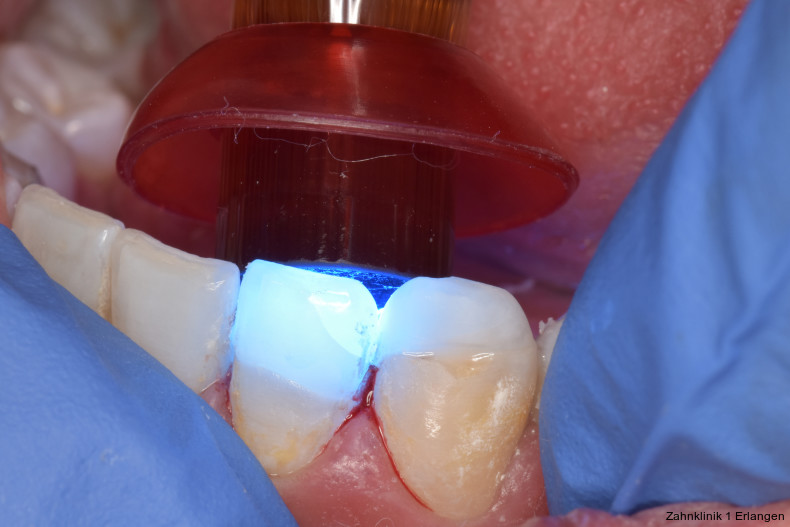 Unkomplizierte Kronenfrakturen mit Verlauf im Dentin sind als Wundfläche einzuschätzen, bei der es bei anhaltender Exposition zum Mundhöhlenmilieu zur Infektion der Pulpa über freiliegende Dentintubuli kommen kann. Somit ist ein wesentlicher Grundsatz der Erstversorgung, die Dentinwunde abzudecken,3, 8 vor allem bei jungen Patienten mit großlumigen Dentintubuli. Die Abdeckung kann im Zuge der Notfallbehandlung mit Glasionomerzement erfolgen oder mittels fließfähigem Komposit unter Verwendung eines Dentinadhäsivs. Hilfreich im Hinblick auf die spätere Wiederentfernung ist dabei die Verwendung eines falschfarbenen oder opaken Materials, um die provisorische Abdeckung bei der definitiven Versorgung gezielt wieder entfernen zu können. Bei pulpanahen Verletzungen empfiehlt sich die Abdeckung mit einem biokompatiblen Material wie hydraulischem Kalziumsilikatzement oder Kalziumhydroxid im Sinne einer indirekten Überkappung.3 Betroffene Zähne können durch Wiederbefestigung des Zahnfragmentes9 oder mit Komposit restauriert werden, dies kann jedoch auch erst bei der Weiterbehandlung erfolgen.