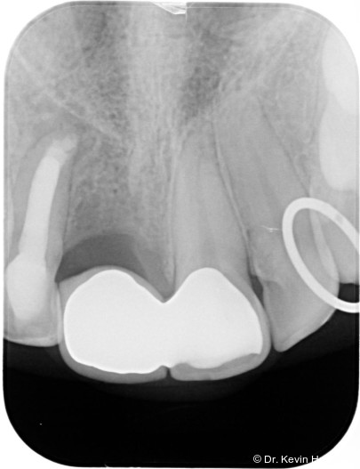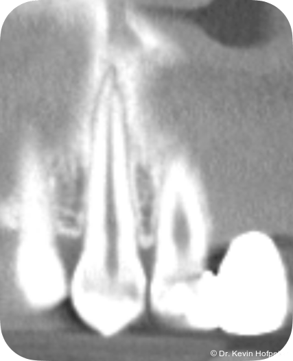 Eine 19-jährige Patientin wurde zur endodontischen Behandlung der Zähne 12 und 13 überwiesen. Laut Überweisung bestand die Diagnose einer zystischen Läsion, welche im Anschluss chirurgisch therapiert werden sollte. Die Anamnese ergab einen schweren Sturz im Alter von sechs Jahren, in dessen Folge Zahn 11 extrahiert und durch eine Komposit-Klebebrücke ersetzt worden war. Aktuell berichtete die Patientin lediglich über gelegentliches Druckgefühl im Bereich von Zahn 12.
