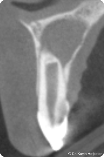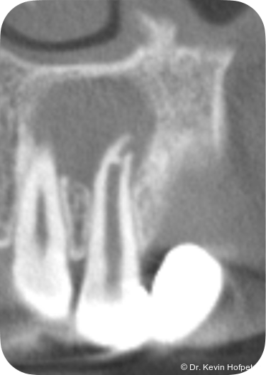 Die Pathogenese apikaler Zysten ist bislang nicht abschließend geklärt.4 Sicher ist jedoch, dass sie von einer nicht keratinisierten Epithelauskleidung variabler Dicke umgeben sind und charakteristischerweise Cholesterinkristalle im Lumen enthalten. Ihre Entstehung setzt einen chronischen Reiz im Sinne einer persistierenden Infektion voraus. Man nimmt an, dass endodontisch bedingte Zysten aus der Proliferation epithelialer Zellreste der Malassez’schen Epithelscheide hervorgehen.3 Zysten können jedoch weder klinisch noch radiologisch verifiziert werden.5 Trotzdem ist es so, dass die Größe einer Läsion als prognostisch ungünstiger Faktor für den endodontischen Erfolg gilt. Vor diesem Hintergrund erschien in dem hier vorgestellten Fall eine vollständige Ausheilung der weit ausgedehnten Läsion zunächst fraglich.6, 7