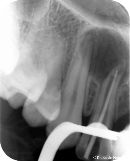 Die Trepanation von Zahn 12 erfolgte unter Kofferdam und OP-Mikroskop. Das weite Kanallumen erlaubte direkte Sicht auf die apikale Hartgewebsformation. Eine mesiale Kanalabzweigung war sondierbar. Nach dem initialen Scouting konnte die Hartgewebsbrücke wegen massiven Blut- und Pus-Exsudats nicht vollständig entfernt werden. Es erfolgte eine ausgiebige Spülung mit einer kombinierten Lösung aus einem Prozent Natriumhypochlorit (Hedinger) und Dual Rinse® HEDP (Medcem). Die Herstellung der kombinierten NaOCl-HEDP-Spüllösung erfolgt klinisch einfach: 10 ml Natriumhypochlorit werden mit einer HEDP-Kapsel vermischt. Der Mischvorgang dauert ein bis zwei Minuten, bis das HEDP vollständig gelöst ist. Die entstehende Lösung wirktgewebsauflösend, desinfizierend und entkalkend. Aufgrund der begrenzten Stabilität (ca. eine Stunde) sollte die Lösung direkt vor der Behandlung angerührt werden, was während der Anästhesiezeit und des Anlegens des Kofferdams problemlos möglich ist.8 Die Aktivierung erfolgte mit einer Reinigungsfeile (XP Finisher R, FKG Dentaire) und einer Ultraschallspitze (IRRIsafe, Acteon). Anschließend wurde eine frisch angerührte Kalziumhydroxid-Einlage (Ca[OH]-Pulver mit 1 % NaOCl) eingebracht.
