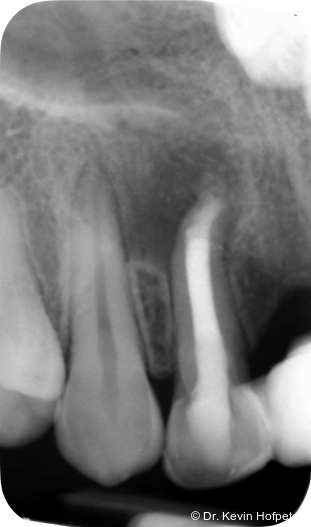 Geplant wurde eine Wurzelkanalbehandlung an Zahn 12. Die zunächst vorgesehene Zystektomie mit Wurzelspitzenresektion wurde zurückgestellt, um die Heilungstendenz nach orthograder Therapie zu beurteilen und einen chirurgischen Eingriff möglichst zu vermeiden.