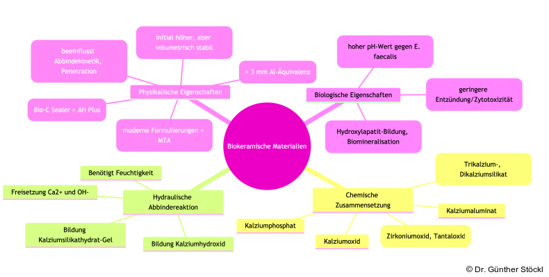 Die klinische Leistungsfähigkeit biokeramischer Materialien beruht auf einer Kaskade von miteinander verknüpften Eigenschaften, die ihren Ursprung in der chemischen Zusammensetzung haben. Die hydraulische Reaktion führt nicht nur zur Aushärtung, sondern initiiert auch die Freisetzung von Ionen. Dies erzeugt ein hochalkalisches Milieu, welches die exzellente Biokompatibilität und die nachhaltige antimikrobielle Wirkung bedingt und zugleich als Katalysator für die Bioaktivität – die Bildung von Hydroxylapatit – fungiert. Dieser Prozess gipfelt in einer chemischen Anbindung an das Dentin und einem hermetischen Verschluss. Parallel dazu gewährleisten optimierte physikalische Eigenschaften eine zuverlässige klinische Anwendung.