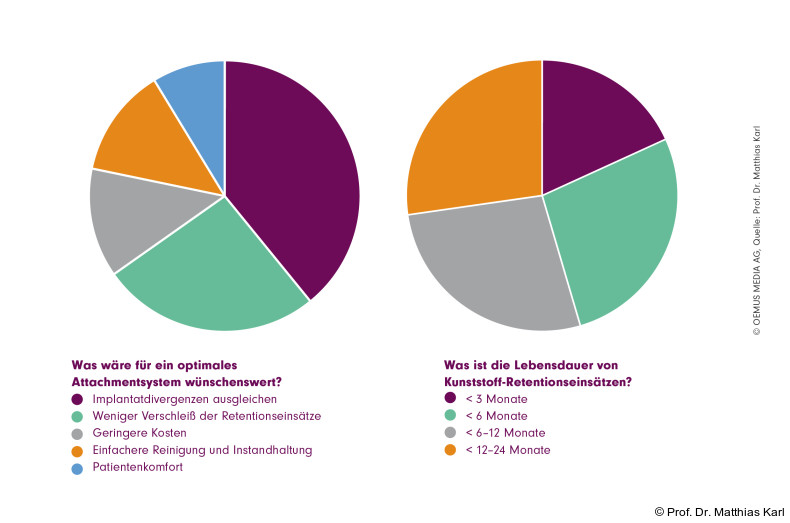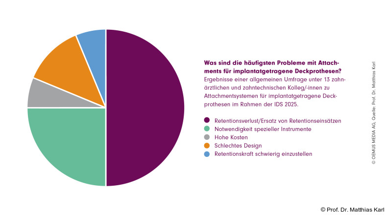 Insgesamt 13 zahnärztliche und zahntechnische Kolleg/-innen beantworteten eine im Rahmen der IDS 2025 durchgeführte allgemeine Umfrage zu Attachmentsystemen für implantatgetragene Deckprothesen, wobei Mehrfachnennungen möglich waren. Der Retentionsverlust wurde dabei als häufigstes Problem beschrieben, gefolgt von der Notwendigkeit spezieller und systemspezifischer Instrumente. Dies deckt sich mit den Ergebnissen aus der Literatur, welche Retentionsverlust als die wesentliche Komplikation nennen. Die Lebensdauer von Kunststoff-Retentionseinsätzen wurde in weiter Streuung mit unter drei bis zu 24 Monaten angegeben. Diese Spanne lässt sich durch unterschiedliche Grade an Parallelität der unterstützenden Implantate erklären. Als wünschenswert für Attachmentsysteme wurden folgerichtig die Fähigkeit zur Kompensation nicht paralleler Implantate sowie eine längere Lebensdauer der Retentionseinsätze erwähnt.