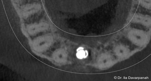 Postoperativ kam es trotz korrekter Implantatpositionierung und regelrechter Sofortversorgung zu einer Fraktur des Implantatkörpers im Bereich der Implantatschulter. Die radiologische Diagnostik mittels Röntgen und DVT zeigte ein Aufplatzen des Implantats im Übergangsbereich zwischen Konusverbindung und Implantatplattform. Das Frakturmuster deutete auf eine strukturelle Überlastung im hoch beanspruchten Schulterbereich hin. Implantatfrakturen stellen insgesamt eine seltene, jedoch für Patient und Behandler belastende Komplikation dar. Sie treten bevorzugt in Regionen mit erhöhten Biege- und Querkräften auf, insbesondere in der Frontzahnregion und bei frühzeitiger funktioneller Belastung.