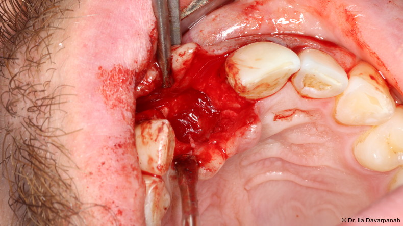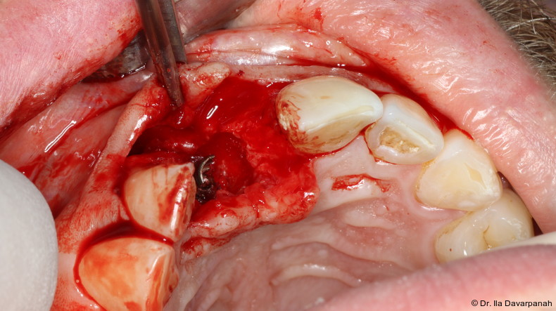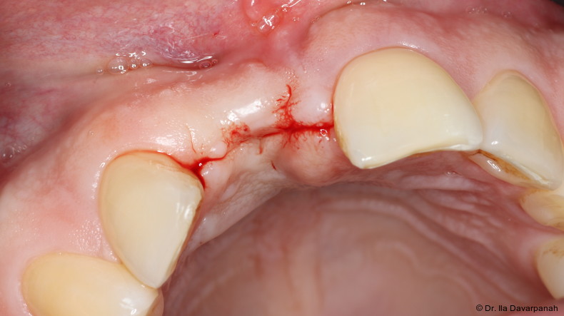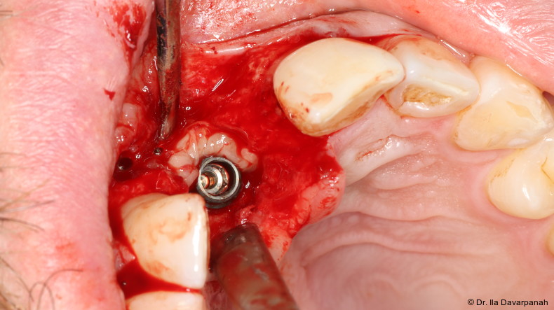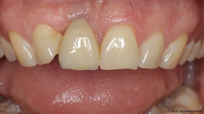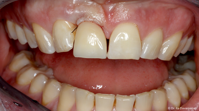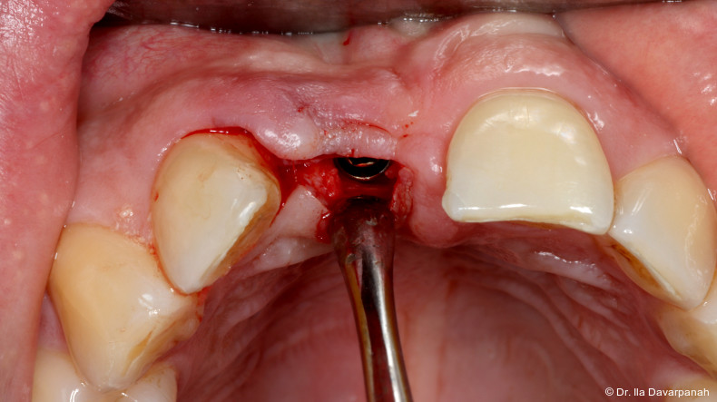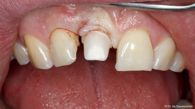 Nach Entfernung des frakturierten Implantatkörpers erfolgte eine erneute Sofortimplantation mit einem alternativen Implantatdesign. Begleitend wurden Maßnahmen zur Stabilisierung von Hart- und Weichgewebe durchgeführt.