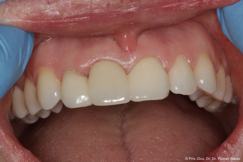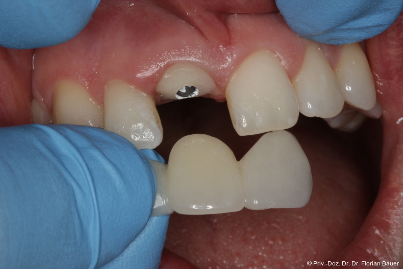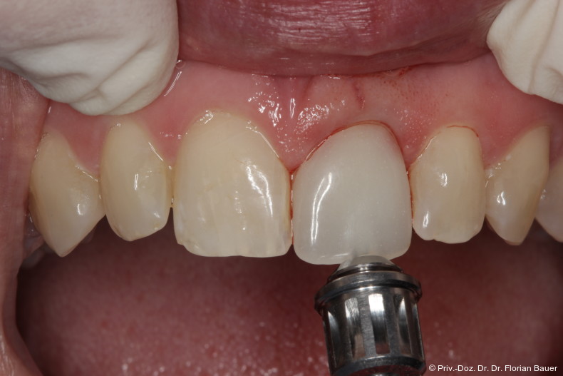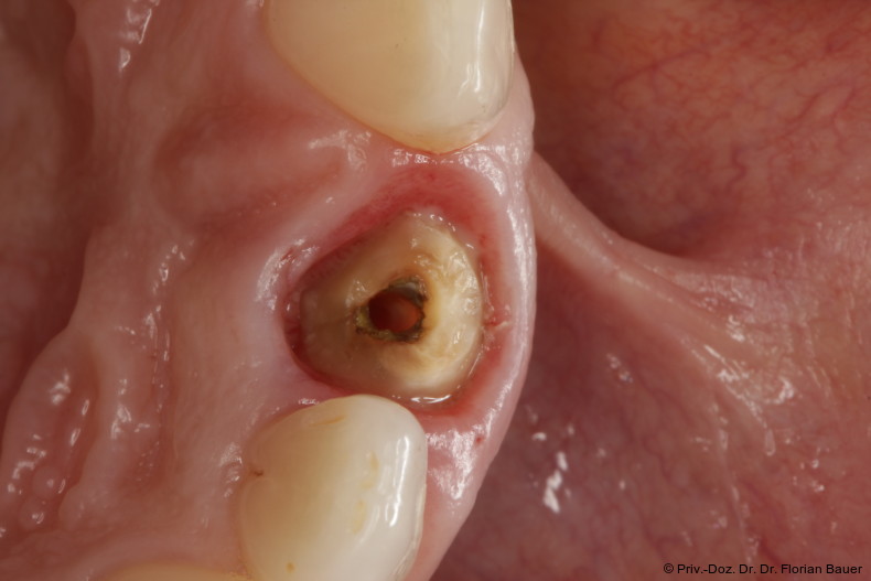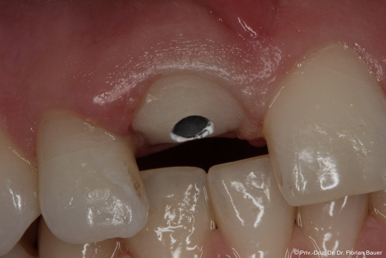 Der 46-jährige Patient stellte sich mit einem insuffizienten und devitalen Zahn 21 vor, der eine zahnärztliche Versorgung erforderte. Nach der Extraktion des Zahns wurde ein Implantat inseriert, wobei der Fokus auf einer zukünftigen verschraubten Krone lag (Abb. 9).