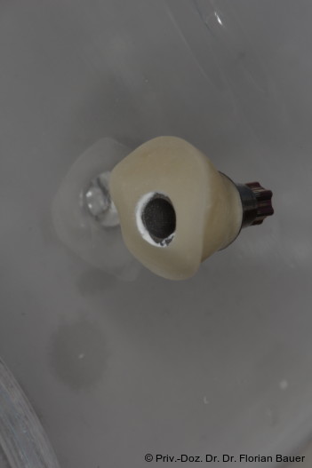 Sechs Monate nach der Implantation wurde die Osseointegration des Implantats mithilfe der ISQ-Messung (Osstell®) überprüft. Nachdem die erfolgreiche Integration bestätigt war, wurde die finale, identisch geformte Zirkonkrone mit einer okklusal verschraubten Verbindung eingesetzt.