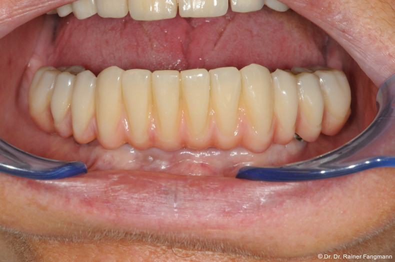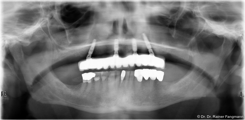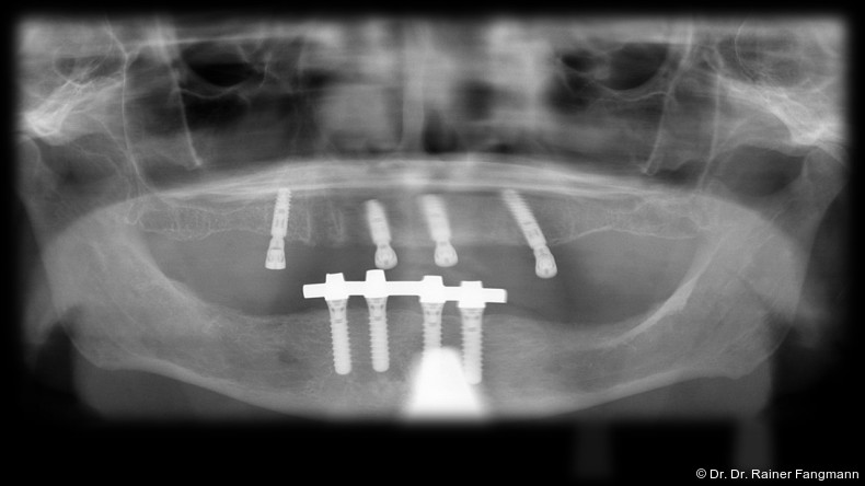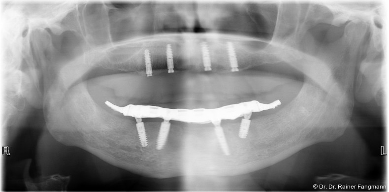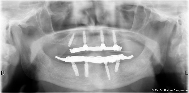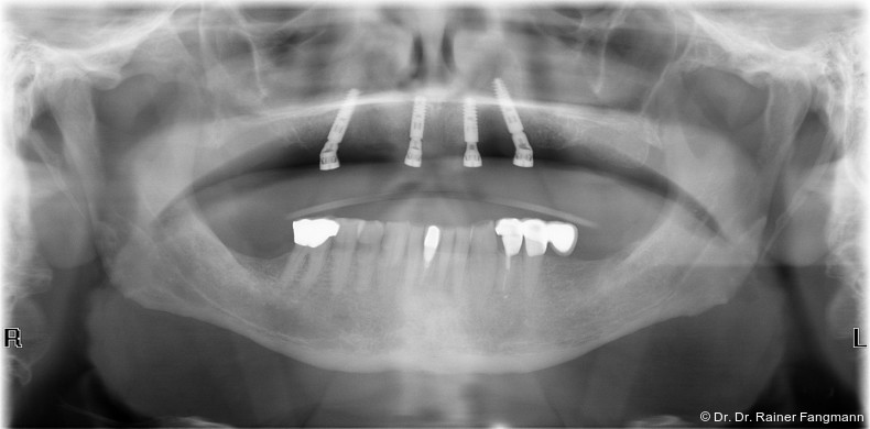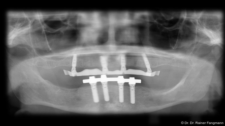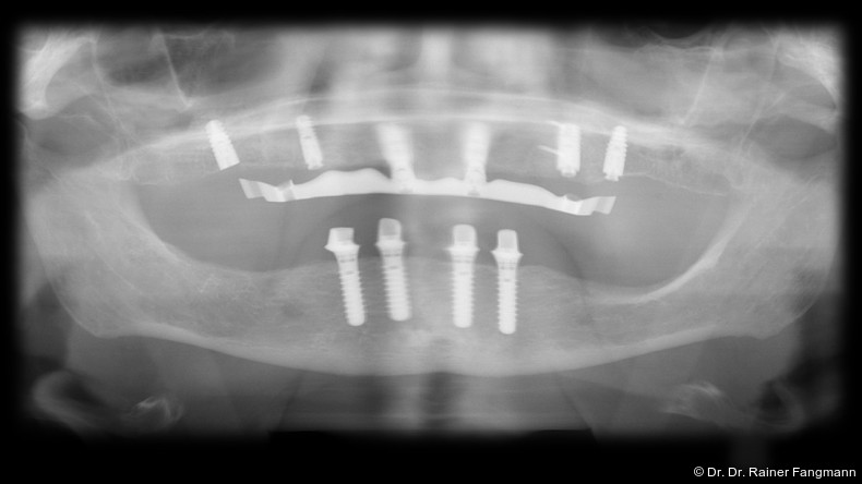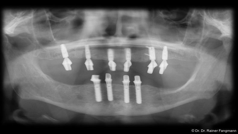 Ein immer viel diskutiertes Thema ist die Implantatanzahl beim All-on-X-Konzept. Diese ist von vielen Faktoren abhängig. Zu nennen sind der Implantattyp, der Implantatdurchmesser und die Implantatinnengeometrie. Im Weiteren sind die Knochenqualität und -quantität zu betrachten. Auch spielt die Gegenbezahnung zum All-on-X-Kiefer eine entscheidende Rolle, sodass hier keine einheitliche Linie für den Oberkiefer erkennbar ist. Es gelten in der Regel vier bis sechs Implantate als ausreichend. Im Unterkiefer sind es in der Regel vier. Wie dargestellt, reichen bei diesem Implantatsystem auch drei Implantate aus.