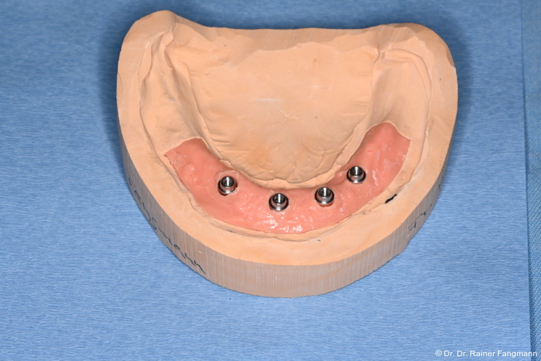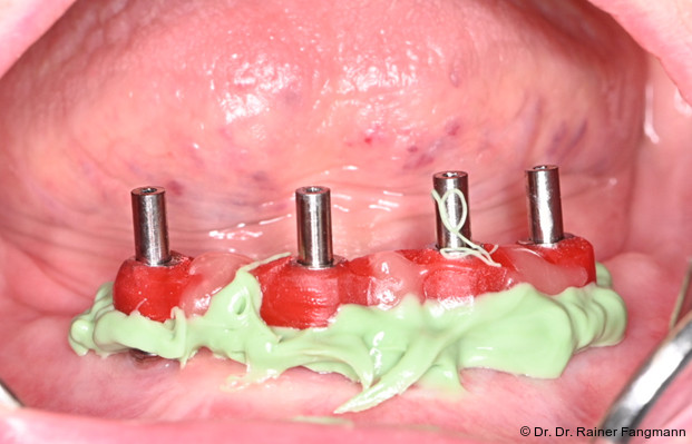 Eine Besonderheit ist die Verblockung der Abformpfosten untereinander mit Acrylatkunststoff und Zahnseide. Hierbei werden zunächst die Gingivaformer abgeschraubt und entfernt. Dann werden die Abformpfosten für die offene Implantatabformung aufgeschraubt. Im nächsten Schritt werden die Implantatabformpfosten mit Zahnseide in 8er-Ligaturen untereinander verblockt. Die Zahnseide wird mit schrumpfungsarmem Acrylatkunststoff (GC Pattern Resin™ LS) verstärkt.