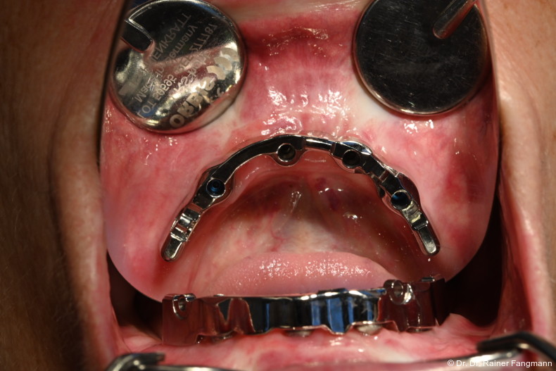 Im zweiten Beispiel lockerten sich die Basisaufbauten bei der Stegeinprobe. Die Abutments wurden refixiert und die prothetische Arbeit fortgesetzt. Nach einem Jahr Tragezeit kam es zum Implantatverlust und Implantatbruch bei den refixierten Abutments. Es wurden Implantate nachgesetzt und das Konzept der Stegversorgung verlassen. Es erfolgte eine Umstellung auf eine teleskopierende Arbeit sowohl im Oberkiefer und prophylaktisch auch im Unterkiefer, obwohl es in der S3-Leitlinie keine Empfehlung für diese Versorgungsform gibt. Bei der Refixierung der Abutments kam es zu Vernachlässigung der Passive-Fit-Anforderung. Bei einem indexfreien Abutment ist die 360° Drehbarkeit gegeben. Das lässt eine freie prothetische Gestaltbarkeit zu. Bei Abutmentlockerung ist dann der Steg neu anzufertigen, da die Passive-Fit-Passung der Suprastruktur nicht mehr möglich ist. Bei indexierten Abutments ist durch die chirurgische Implantatinsertion die prothetische Ausrichtung vorgegeben. Die indexfreien Abutments geben dem Prothetiker mehr Freiheiten.