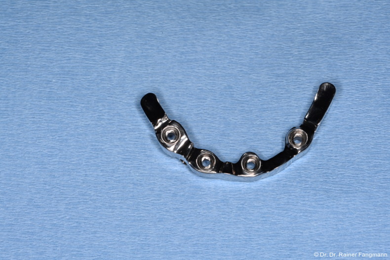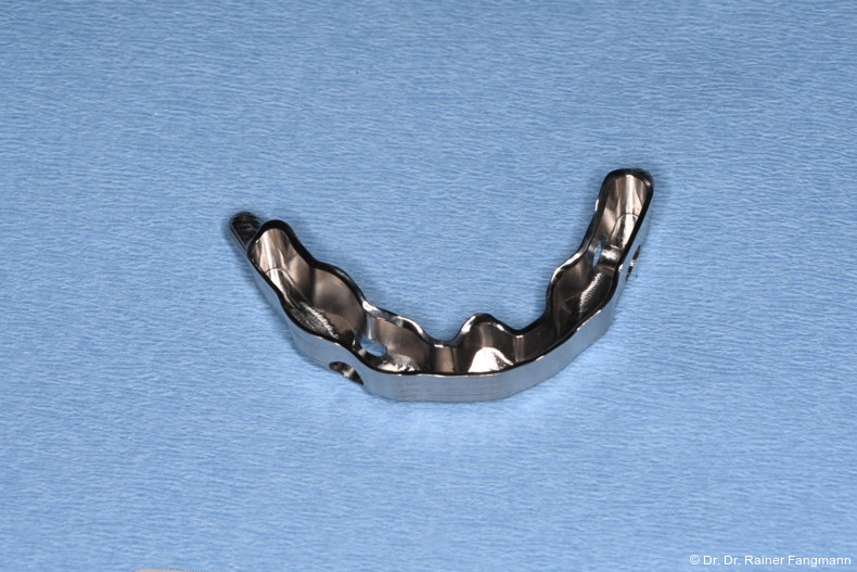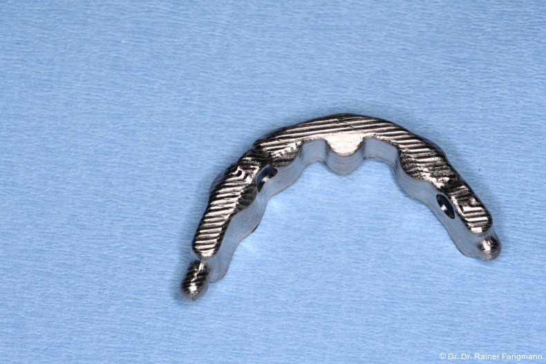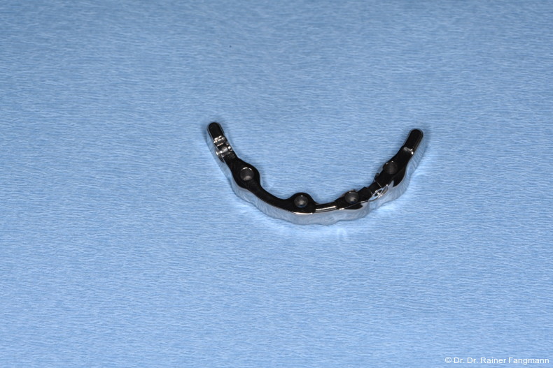 Im ersten Beispiel erschien die Patientin nach prothetischerRehabilitation mit einem gegossenen Steg mit Schmerzen am rechten äußeren Implantat. Nach Lösung dieser Schraube kam es zur Besserung der Beschwerden. Der gegossene Steg wies kein Passive-Fit auf.