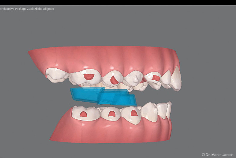 Hier könnten die neuesten technologischen Entwicklungen einen echten Paradigmenwechsel einläuten. Der im Beitrag bereits erwähnte Aligner-Hersteller stellte jüngst eine integrierte Lösung, die sognannten Occlusal Blocks vor.8 Diese ermöglichen, die Unterkiefervorverlagerung direkt innerhalb der Aligner-Schiene zu realisieren – ohne zusätzliche herausnehmbare Geräte. Diese Occlusal Blocks sind präzise designte Aufbisselemente innerhalb der Aligner, die eine kontrollierte Vorpositionierung des Unterkiefers während des Wachstums ermöglichen und dadurch die sagittale Korrektur effizient unterstützen können. Damit bieten diese neuen Okklusalblöcke eine vielversprechende Möglichkeit, gerade bei Jugendlichen im Wachstum die Vorteile der funktionskieferorthopädischen Therapie direkt mit der ästhetischen und hygienischen Überlegenheit der Aligner-Technologie zu kombinieren. Es spricht daher nichts dagegen, zukünftig noch konsequenter hybride Strategien oder diese neuen integrierten Lösungen zu verfolgen, um das Wachstum optimal auszunutzen und zugleich die Gesamtbehandlungsdauer deutlich zu verkürzen.