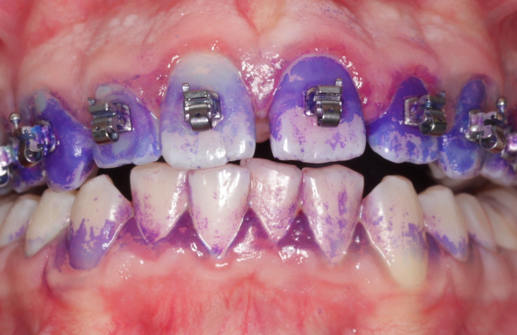 Eine weitere Empfehlung im Konsensuspapier ist: Die Zahnoberflächen sollen während der gesamten Behandlung durch eine visuelle Untersuchung auf das Auftreten und auf den Schweregrad von „white spot lesions“ untersucht werden. Wir sagen in der modernen Kariologie ja, wie oben erwähnt, nicht mehr „white spot lesion“, sondern initiale kariöse Läsion. Also im Grunde nichts anderes, als dass sowohl Zahnarzt als auch Kieferorthopäde beide auf die Hartsubstanz und auf die Gingiva achten. Dann wird weiterhin empfohlen: Die Ergebnisse der visuellen Untersuchungen sollen so detailliert aufgezeichnet werden, dass ein Vergleich im Zeitverlauf möglich ist. Standardisierte Fotografien können diese Vergleiche unterstützen. Das machen die Kieferorthopäden zu bestimmten Zeitpunkten, weil sie ja regelmäßig die Patientenzähne fotografieren. Inwieweit die dentale Fotografie in der Zahnarztpraxis ein Thema ist, steht und fällt mit der Praxisstruktur. Eine einfache Empfehlung ist, wenn Jugendliche – die ja mittlerweile fast alle ein Smartphone haben – in der Behandlung von ihren Zähnen ein „Selfie“ machen. Dann macht der Patient das Foto selbst, und als Behandler hat man kein Datenschutzproblem. Wenn man vorher die Zähne anfärbt, dann sieht der Jugendliche sofort, wovon man spricht (Abb. 2).