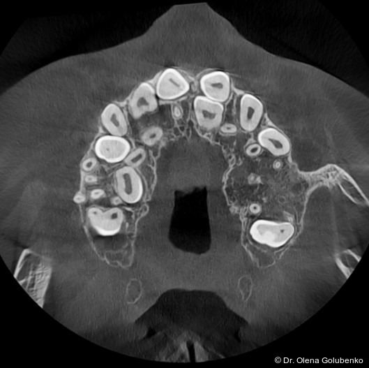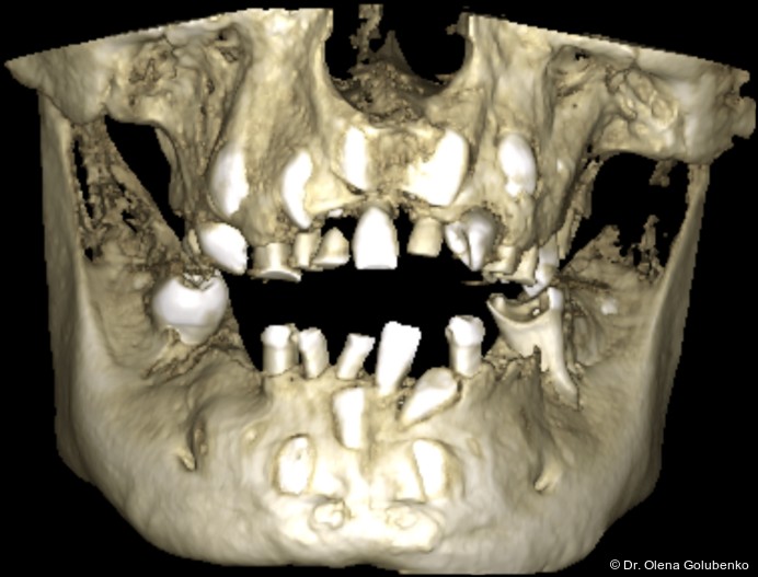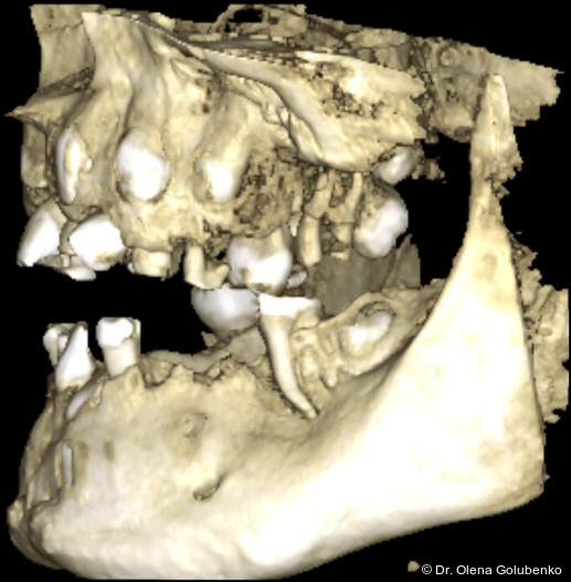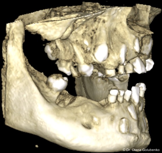 Die dreidimensionale Bildgebung zeigt meist eine hohe Anzahl nicht durchgebrochener permanenter und überzähliger Zähne, die in unterschiedlicher Lage im Kiefer verbleiben (Abb. 3+4).