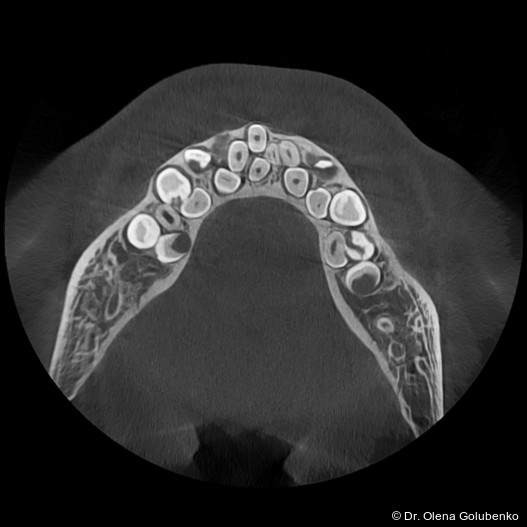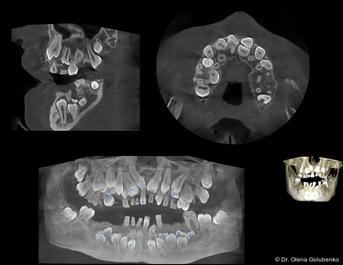 Im vorliegenden Fall erfolgte die Überweisung durch eine zahnärztliche Kollegin mit der Bitte um kieferorthopädische Einschätzung des weiteren Vorgehens angesichts multipler nicht durchgebrochener Zähne, persistierender Milchzähne und zahlreicher überzähliger Zahnkeime.1
