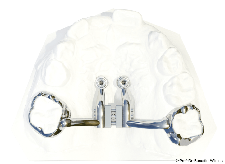 - Einsatz von mehreren verschiedenen Apparturen auf denselben Miniimplantaten, zum Beispiel erst eine Hybrid Hyrax zur Expansion, dann ein Beneslider zur Distalisierung. In dem in diesem Artikel beschriebenen Fall wurde zunächst eine Hybrid Hyrax zur Expansion, anschließend eine „Mausefalle“ zur Molarenintrusion eingesetzt.
