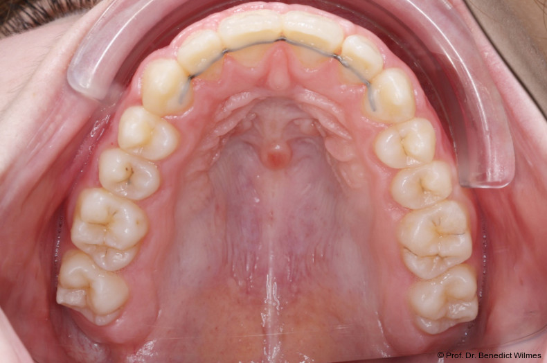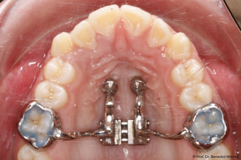 Die initiale Behandlung erfolgte mit einer CAD/CAM Hybrid Hyrax zur Expansion des Oberkiefers, verankert an zwei paramedianen Miniimplantaten (Abb. 4, Benefit, 2,0 x 9,0 mm). Anstelle klassischer Molarenbänder wurden Shells (geklebte Kappen) verwendet, wodurch die beiden Schritte Separieren und Anpassen von Molarenbändern entfallen. Die Miniimplantate und die Apparatur wurden dank eines Insertionsguides in nur einer Sitzung eingesetzt.