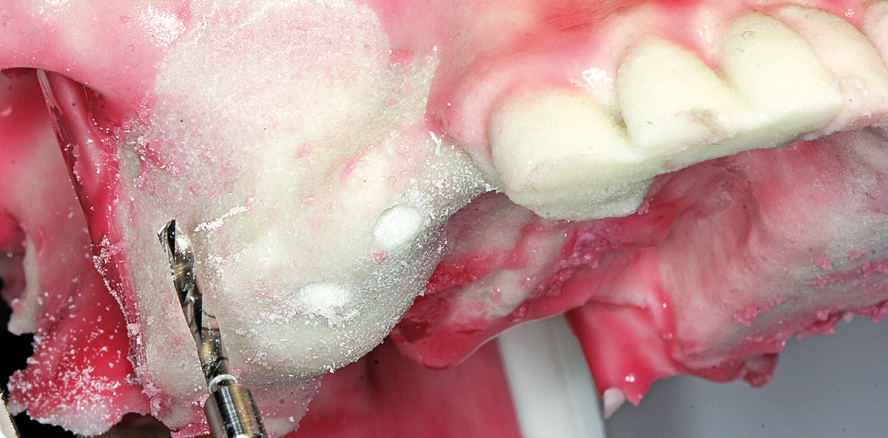 In Zusammenarbeit mit der Firma phacon wurde auf der Grundlage von 3-D-Daten eines Schädel-CTs ein Übungsmodell geschaffen, welches die topografische Anatomie des Oberkiefers nach Zahnverlust im Oberkieferseitenzahngebiet zeigt.
