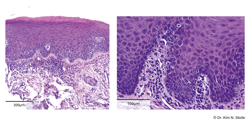 Lassen sich histologisch Dysplasien bestätigen, können klinisch homogene, histologisch als „low grade“ gewertete Läsionen zunächst beobachtet werden, „high grade“ klassifizierte Läsionen hingegen (Abb. 3a–c) sollen vollständig exzidiert werden.24