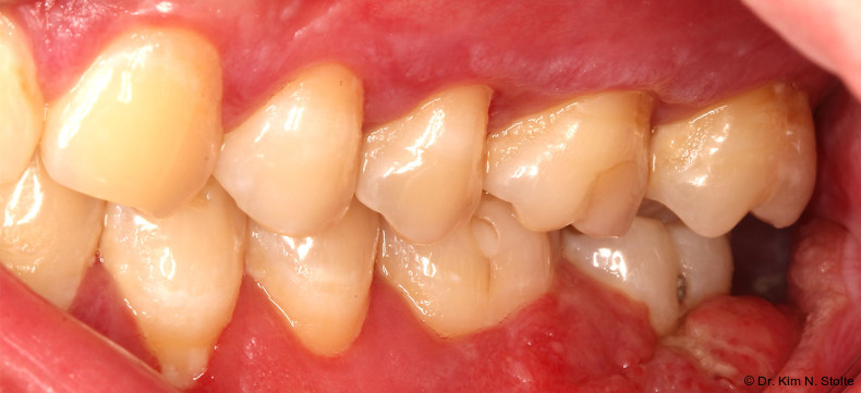 Systematische Übersichtsarbeiten belegen erhöhte Blutungs- und Sondierungswerte bei Personen mit oralem Lichen planus, dies prädisponiert Betroffene für die Entwicklung einer Parodontitis.28, 29 Als Ursache wird häufig die erschwerte Plaquekontrolle bei schmerzhaften Mundschleimhautläsionen angegeben. Der Lichen planus wird in der aktuellen Klassifikation unter den „nicht Plaquenduzierten gingivalen Erkrankungen und Zuständen“ geführt.30 Entsprechend sollte vor weiterführenden Therapien bei Indikation eine konsequente Parodontitisbehandlung mit engmaschiger Prophylaxe etabliert werden.