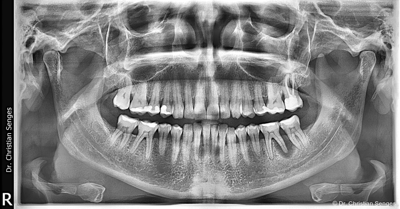 Eine 46-jährige Patientin stellte sich im Mai 2023 in unserer Praxis vor und klagte über Zahnfleischprobleme, insbesondere im Molarenbereich des Unterkiefers links. Ihre psychische Verfassung war instabil aufgrund eines unerfüllten Kinderwunsches, trotz mehrerer Embryonentransfers in den vergangenen Jahren. Die klinische Untersuchung ergab erhöhte Sondierungstiefen von 5 bis 8 mm an den Zähnen 36 und 37, einschließlich Pusaustritt. Der Parodontale Screening-Index (PSI) ergab die Werte 3-4-4-4-4-4. Die Vitalität aller Zähne, insbesondere von Zahn 36, war positiv. Eine anschließende Panoramaschichtaufnahme zeigte generalisierten horizontalen Knochenabbau im Ober- und Unterkiefer mit einer periradikulären Aufhellung an der distalen Wurzel von Zahn 36 sowie eine freiliegende Bifurkation an Zahn 46 (Abb. 1). Die Patientin wurde über die negativen Auswirkungen der Entzündung an Zahn 36 und der unbehandelten Parodontitis für den geplanten Embryonentransfer in naher Zukunft aufgeklärt.