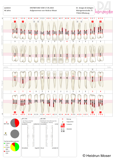 Die Patientin erschien besser stabilisiert zum parodontologischen Aufklärungs- und Therapiegespräch (ATG), bei dem auch die Möglichkeit der Applikation von Schmelz-Matrix-Proteinen (Emdogain) bei tieferen Taschen ab 6 mm besprochen wurde. Die Patientin war einverstanden, dies im Rahmen der AIT durchzuführen. Die Extraktion von Zahn 36 erfolgte nach eingehender Beratung, da die Prognose für den Zahn sehr schlecht war, um mögliche Risiken für den nächsten Embryonentransfer zu minimieren. Im Rahmen der MHU und erfolgter PMPR mit subgingivalem Debridement war ersichtlich, dass sich die Mundhygiene bei der Patientin bereits verbesserte (API: 28 %, SBI: 11 %). Des Weiteren wurden die Interdentalräume erneut kalibriert, es erfolgte eine antientzündliche Ernährungsberatung und ihr wurde eine Probiotika-Kur empfohlen.