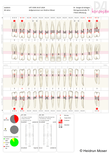 Ende Juni 2023 fand schließlich die AIT statt. Zwei Wochen später kam die Patientin zur Nachuntersuchung: Das Zahnfleisch zeigte keine Entzündungszeichen und die Patientin berichtete, dass ein weiterer Embryonentransfer anstand. Wir ermutigten sie aufgrund des positiven Zustands ihrer Parodontalsituation dazu. Fünf Monate später berichtete die Patientin, dass sie in der 15. Woche schwanger war! Die Befundevaluation (BEV) zeigte eine deutliche Reduzierung der Sondierungstiefen, und die Mundhygiene hatte sich erheblich verbessert.